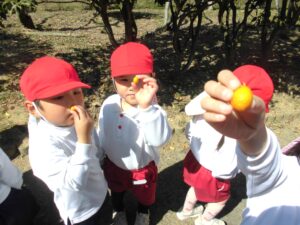 年少さんも花びらやどんぐり、きんかんなどを見つけてにおいをかいだり、春を五感で感じていました。