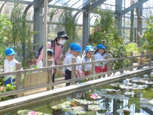 今日は特別に温室の中も見に行った年中さん。大きなサボテンや水に浮かぶ蓮の花をのぞき込んで見ていました。