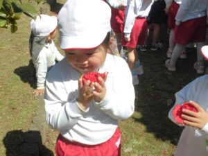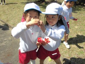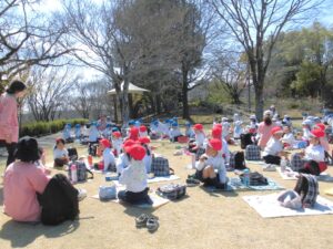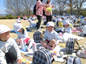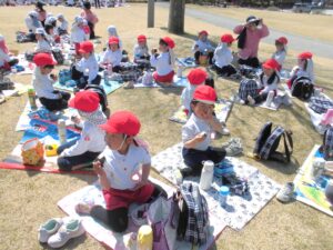 芝生広場に戻ってくると、年中さん年少さんみんなで一緒におにぎり弁当をいただきました。たくさん歩いておなかがすいていたのか、あっという間に食べ終わりました。