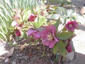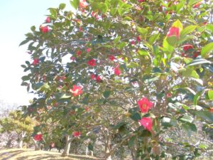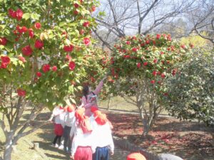 真っ赤なツバキや紫や白のクリスマスローズもきれいでした。「クリスマスローズは下を向いて咲くんだね。」「こんなきれいなのに、茎や根っこに毒があるんだって。」
