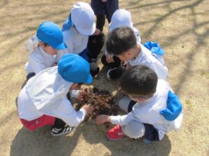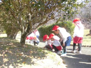 年少さんも花びらやどんぐり、きんかんなどを見つけてにおいをかいだり、春を五感で感じていました。