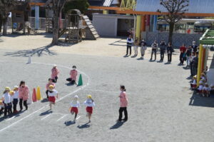 三択クイズで正解すると、大盛り上がり。このあと、お家の方にもリレーを応援していただいて、まふみ幼稚園での最後の誕生会もとても楽しくなりました。
