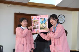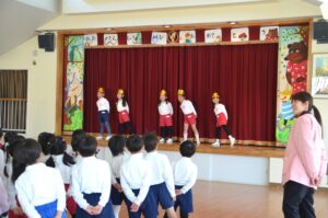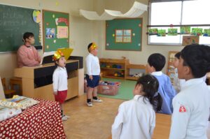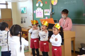 遊戯室の年長さんは、お友だちのインタビューを聞いて、『ドキドキドン 1年生』を歌いました。卒園式の練習も進んでいるので、とても上手になってきました。