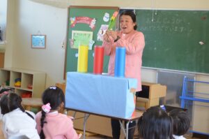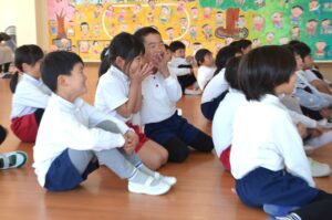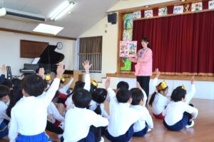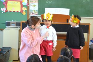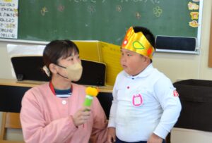 三択クイズで正解すると、大盛り上がり。このあと、お家の方にもリレーを応援していただいて、まふみ幼稚園での最後の誕生会もとても楽しくなりました。