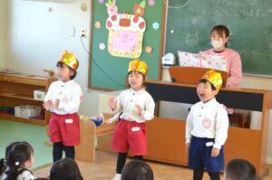 年少さんや年中さんは、お部屋のお友だちとお誕生日や季節のうたを歌ったり先生のインタビューを受けたり、先生のマジックを見たり、このクラスでの最後の誕生会を楽しみました。