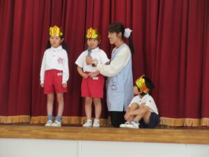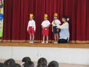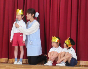 誕生児のお友だちはキラキラの冠をかぶって先生からインタビューを受けたり歌を歌ったりしました。