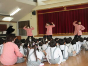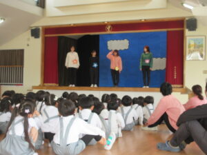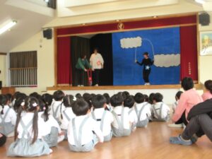 劇の中では「かして」「いいよ」「一緒に遊ぼ」のやりとりに興味津々のまふみっこたち。明日からお友だちと仲良くたくさん遊びましょうね!