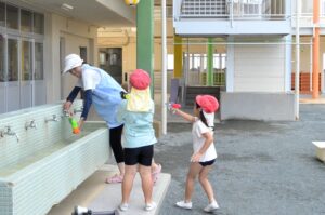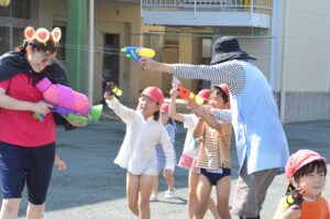 あれあれ、先生たちがなんか大きいみずてっぽうを持ってますよ。それにも負けないまふみっこたち、先生たちもびしょぬれですがとても楽しそうです。