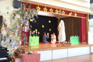 七夕会では、先生から七夕の由来や飾りについてお話を聞いたり、先生たちの劇を観ました。真っ白なおひげの神様が登場すると、泣いてしまう年少さんや嬉しそうな歓声を上げる年長さんもいましたが、最後までよく集中して見ていました。