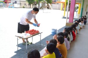 初めての年少さんも、「わたし、すいか大好き!」とパクパク食べるお友だち。「おかわり!」と先生から2つめ3つめをもらっているお友だちもいました。