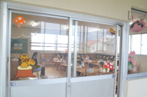 「あー!お部屋のドアの絵が変わってる!」とすぐに気がつく子どもたち。先生たちの力作です。