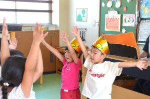 今月、誕生日のお友だちがいる年少さんは2クラス。キラキラの王冠をかぶって、みんなにっこにこ。嬉しそうにお家の方をお迎えしました。