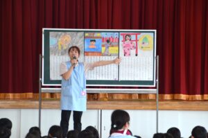 始業式では先生たちの夏休みの思い出絵日記の発表がありました。温泉に行った先生やかき氷をいっぱい食べた先生のお話を聞いて、「ぼくも温泉に行った!」「わたしもかき氷食べたよ!」と楽しそうな声がたくさん聞こえました。