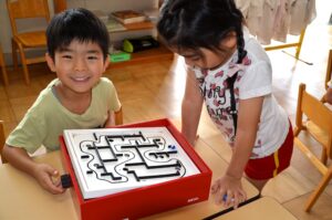 お部屋の中をのぞいてみると、どの部屋も担任の先生が準備していたゲームや積み木、折り紙など自分で遊びを見つけていました。