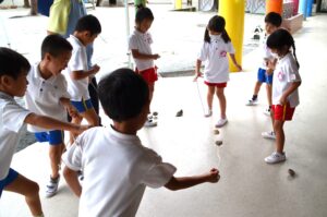 給食を食べてからも、外は雨。年長さんのテラスではこままわし大会が繰り広げられていました。