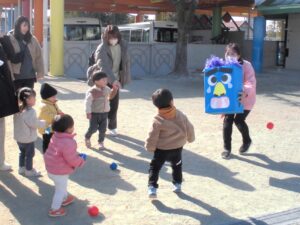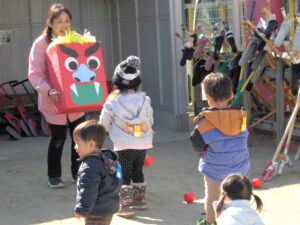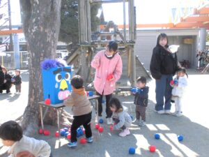 2月最初のマミーズリンクでは、ぷんぷん怒っている怒りんぼ赤オニと、えんえん泣いている泣き虫青オニに、「おにはそと!」とボールを投げて鬼退治をしました。