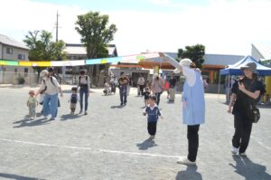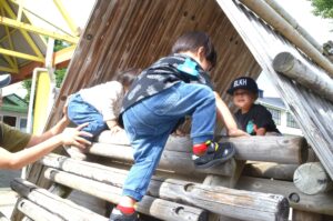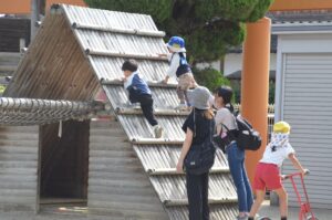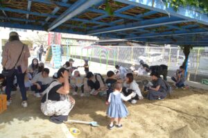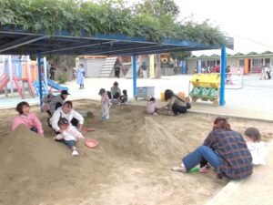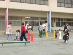 開門と同時にたくさんのお友だちが元気に来てくれて、砂場や三輪車、ブランコ、すべり台、ログハウスやボール遊びなど、お家の方と一緒に遊びました。