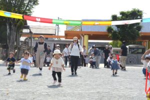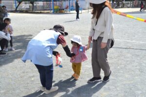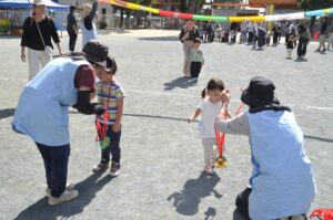 一人でゴール目指して走るお友だち、お家の方と手をつないで走るお友だち、走り終わったお友だちは先生からがんばったねメダルをかけてもらいました。