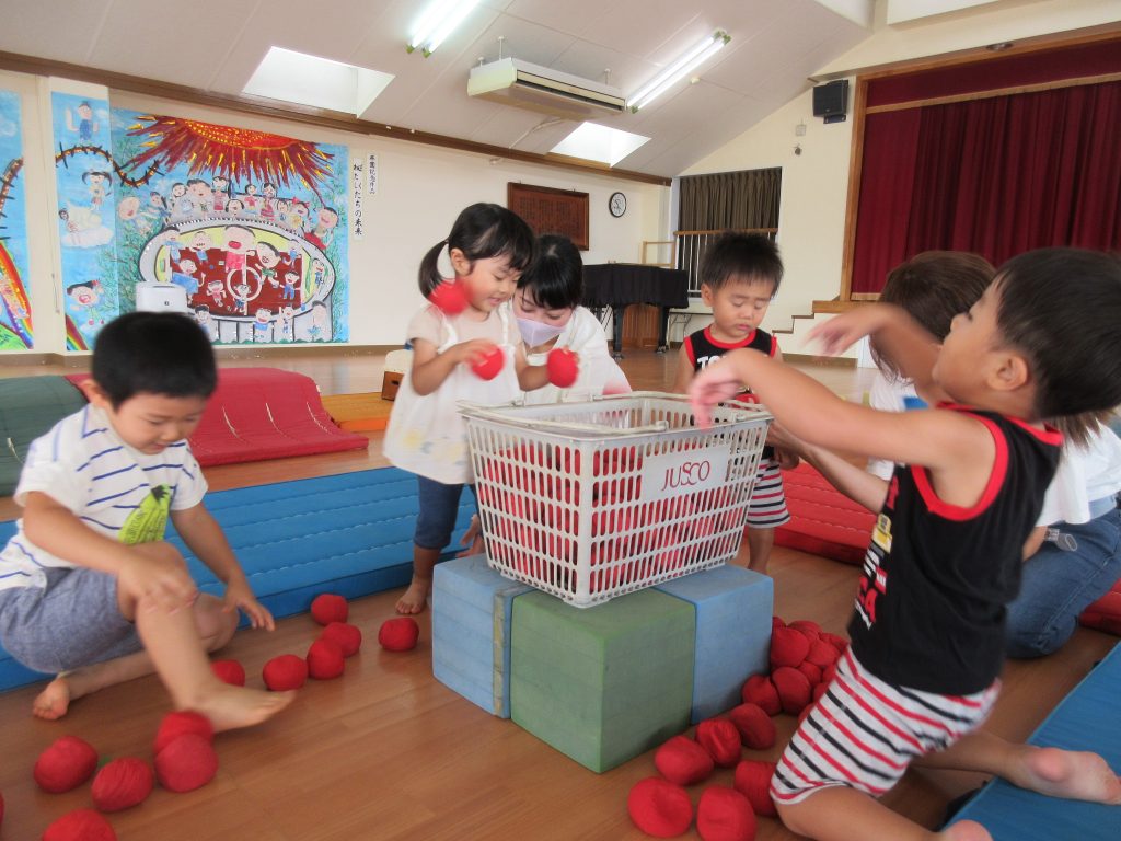 今回のサーキット遊びには、新しく玉入れコーナーができていて、すぐに大人気。